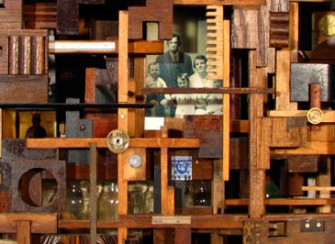 Subsisting for decades on a tiny income, he had produced a series of extraordinary sculptures, collaging new forms out of salvaged wood – often using his own floorboards and furniture and re-working them with an obsessive joinery. His largest piece echoes the L shape structure of Chesney Court but also resembles a curiosity cabinet or old fashioned front room sideboard. These works are not architectural models of Chesney Court but perhaps an exploration of the lives lived within and an expression of the guilt and loss felt by the architect. A fretwork of wooden pieces built up in layers allows glimpses of what lies within – artifacts and ephemera that Joseph may have held dear, although thus far the photographs have not been identified as any of those killed in the disaster. In a sense he lifted the roof off a block of flats and showed how people transform their homes and create meaning for themselves and their own history within it. Perhaps they speak to us of our own mortality.