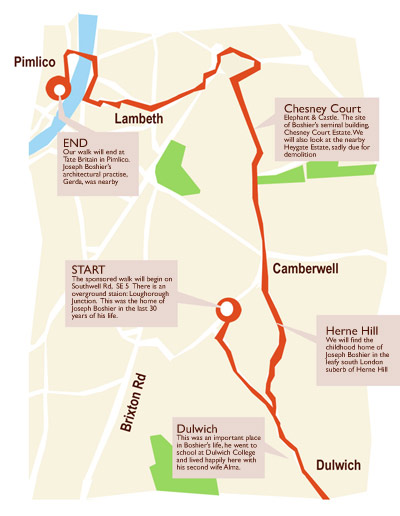 The Joseph Boshier Collective devised a ten mile walk around south London that not only took in all the important sites of Boshier’s life but some of the most exciting architectural views in south London – from Dulwich College to the Heygate Estate.