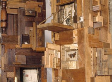 Subsisting for decades on a tiny income, he had produced a series of extraordinary sculptures, collaging new forms out of salvaged wood – often using his own floorboards and furniture and re-working them with an obsessive joinery. His largest piece echoes the L shape structure of Chesney Court but also resembles a curiosity cabinet or old fashioned front room sideboard.